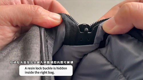 原来,专利设计的防盗锁机制在于右侧包内隐藏的树脂锁扣,拉动拉头直至完全嵌入锁扣内即可解锁。而上锁更是相当快速便捷,只需将底部的下拉头拉至上拉头处两个拉头向内收拢对齐即可,拉感顺滑,持久耐拉!